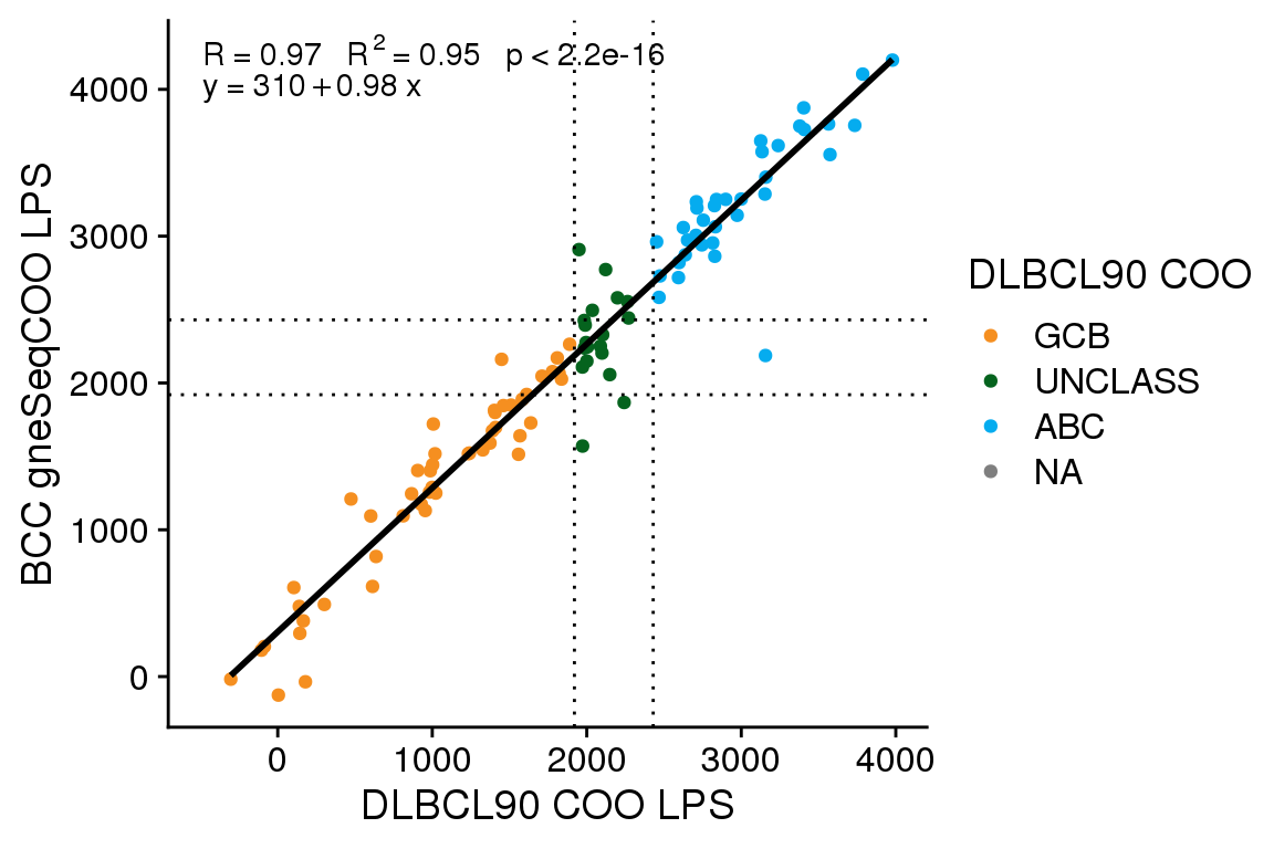 The accuracy of gneSeqDZsig among validation cohort tumors classified as ABC or UNCLASS by the DLBCL90 COO assay is 1 (95% CI 0.96 - 1). There were no frank misclassifications (i.e. switching from DZsig+ to DZsig- or vice versa) when comparing the gneSeqDZsig results to the NanoString results.
