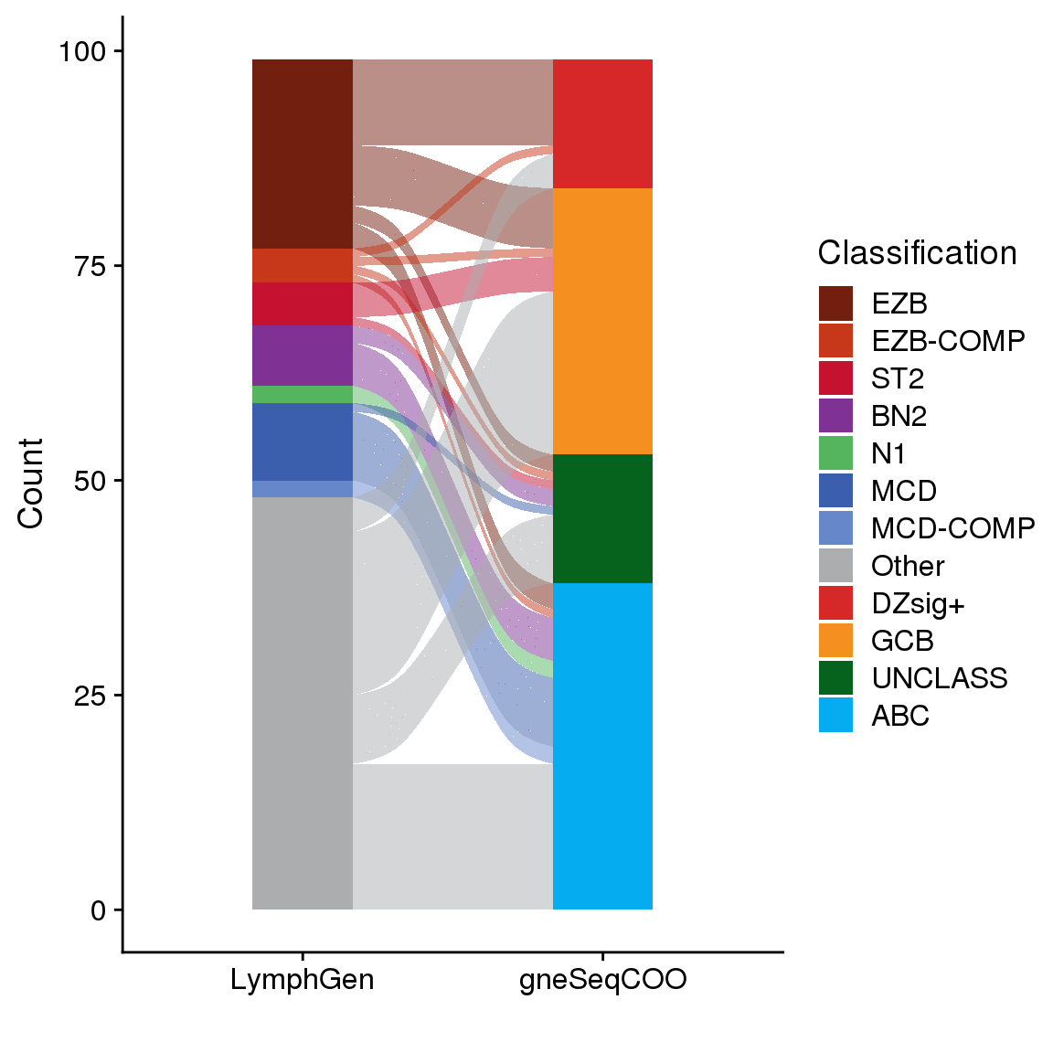 The frank misclassification rate (switching from ABC to GCB) is 1/75 (1.3%) when comparing gneSeqCOO (BG) to NanoString, or 0% when comparing gneSeqCOO (BCC) to NanoString or gneSeqCOO results run at BG vs at BCC.