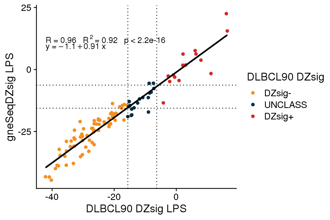 The accuracy of gneSeqDZsig among validation cohort tumors classified as ABC or UNCLASS by the DLBCL90 COO assay is 1 (95% CI 0.96 - 1). There were no frank misclassifications (i.e. switching from DZsig+ to DZsig- or vice versa) when comparing the gneSeqDZsig results to the NanoString results.